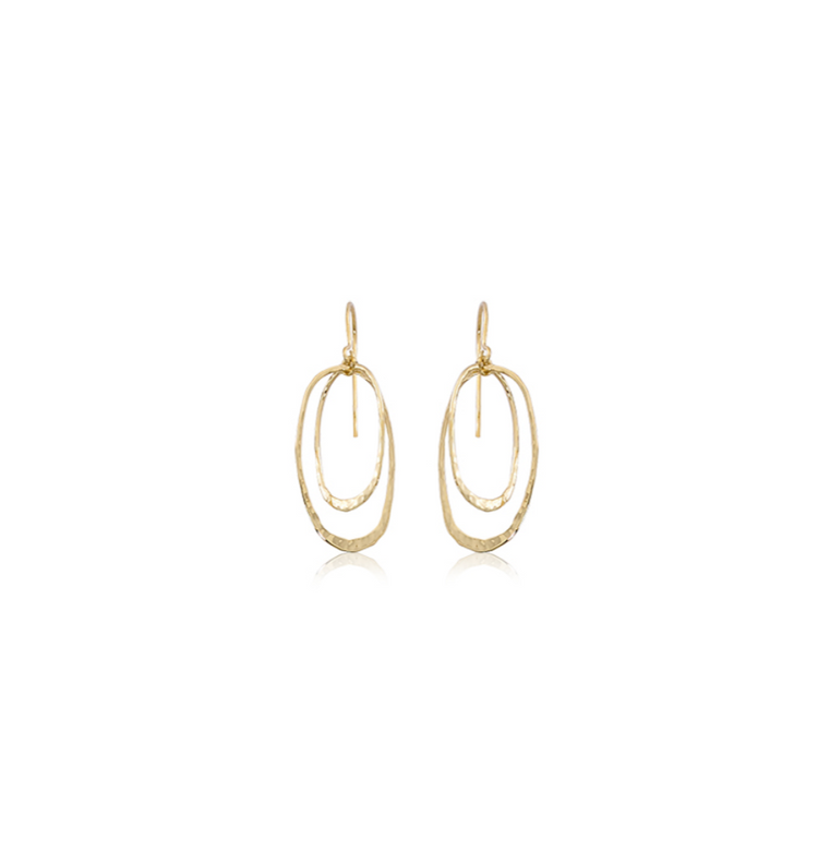 These 14K Yellow Gold drop earrings feature two hammered ovals orbiting around one another. Earrings measure roughly 1 1/2" long