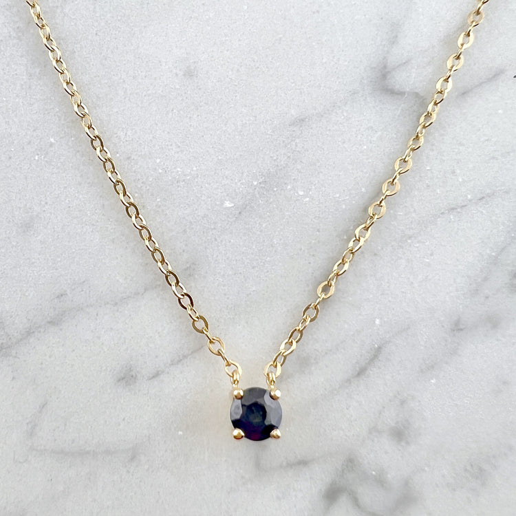 This 14k gold necklace features a beautiful petite blue sapphire in a minimalist four prong setting. The sapphire matched with a beautiful 18" gold cable chain.