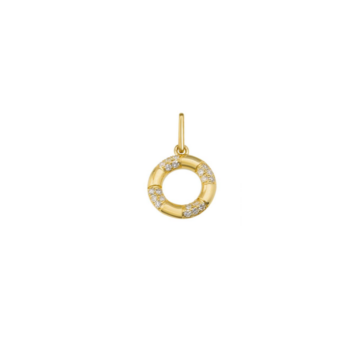 This 14K Gold + Diamond Life Saver Charm is the perfect addition to any nautical collection! This charm has an enhanced bail allowing the charm to be clipped onto a link chain necklace or worn as a pendant. The charm is set in 14K Gold and features .10 ct of petite diamond.