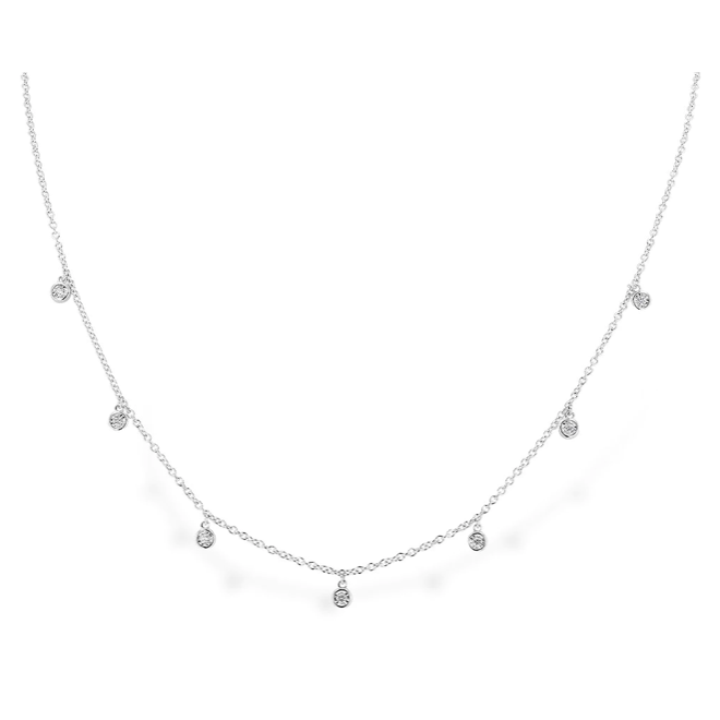 This dainty design is crafted in 14k white gold and features bezel set diamonds. The perfect piece to create a delicate layered look.