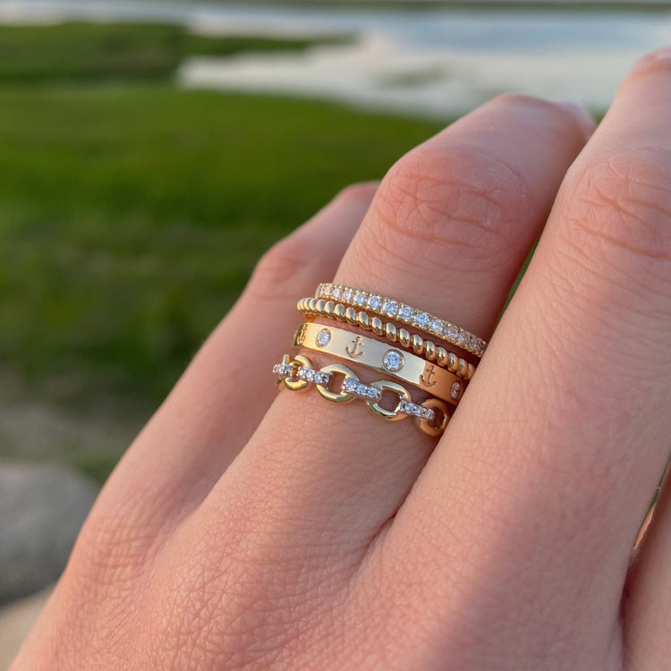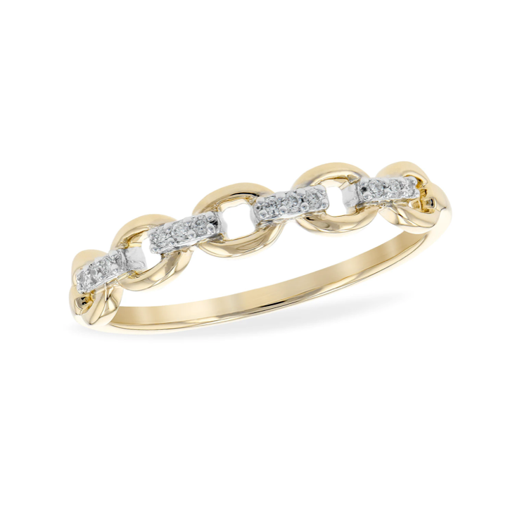 This beautiful ring is made from solid 14k yellow gold and features a thin band of interlocking links and diamond accents, totaling .05 cts.