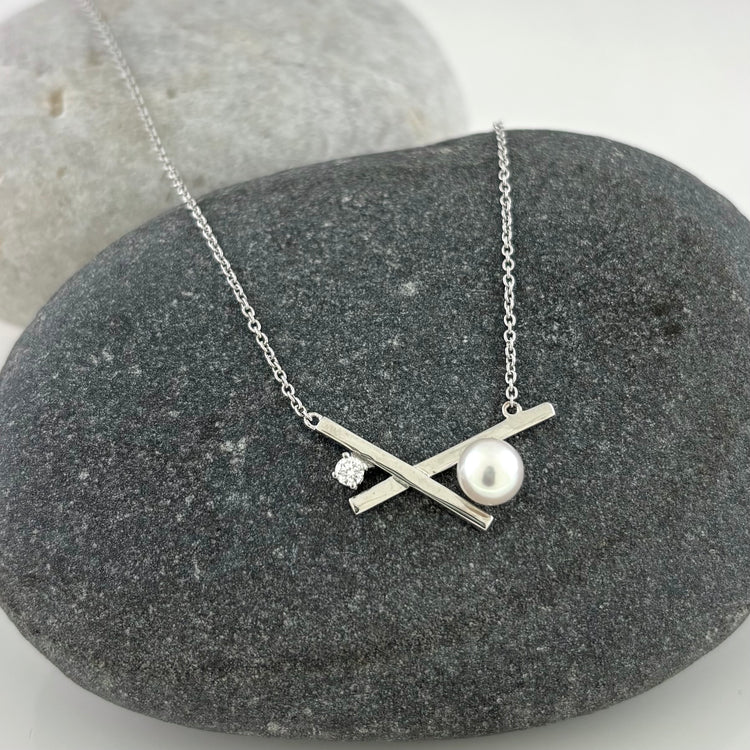 This new design is an updated take on the XO hugs and kisses symbol of love.  Sterling silver crossed bars are accented with a sparkling natural .07 ct diamond and a shimmering 6mm cultured freshwater pearl.  Easy to dress up or down.  Pearls are always on trend! Available in 16 or 18 inches.