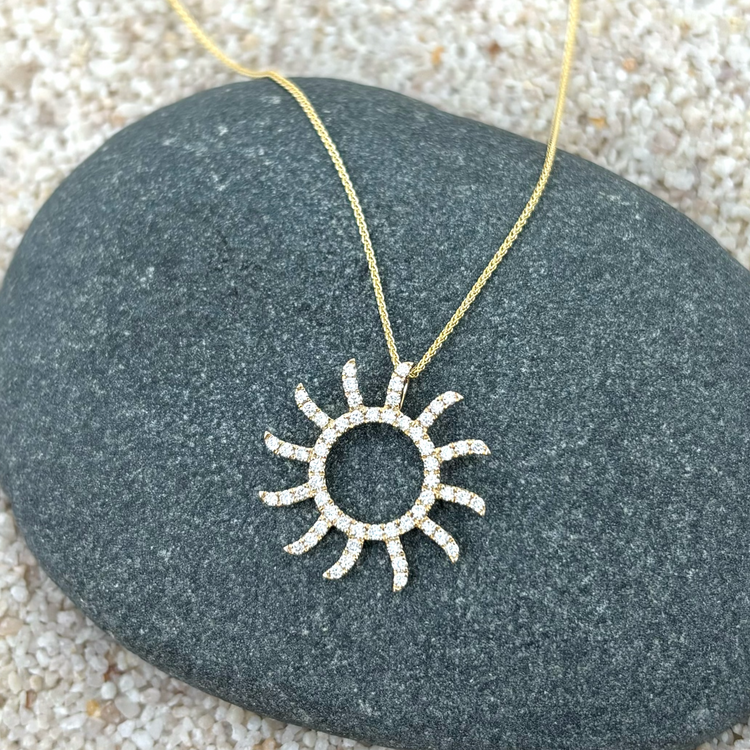 This necklace features petite diamonds set in a 14K yellow gold sun design! Choose the pendant alone or on a 14K gold chain available in adjustable 16-18" or 20" lengths.