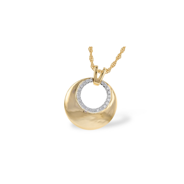 This highly polished disc necklace is crafted in 14K yellow gold and features a band of diamonds set in 14K white gold.