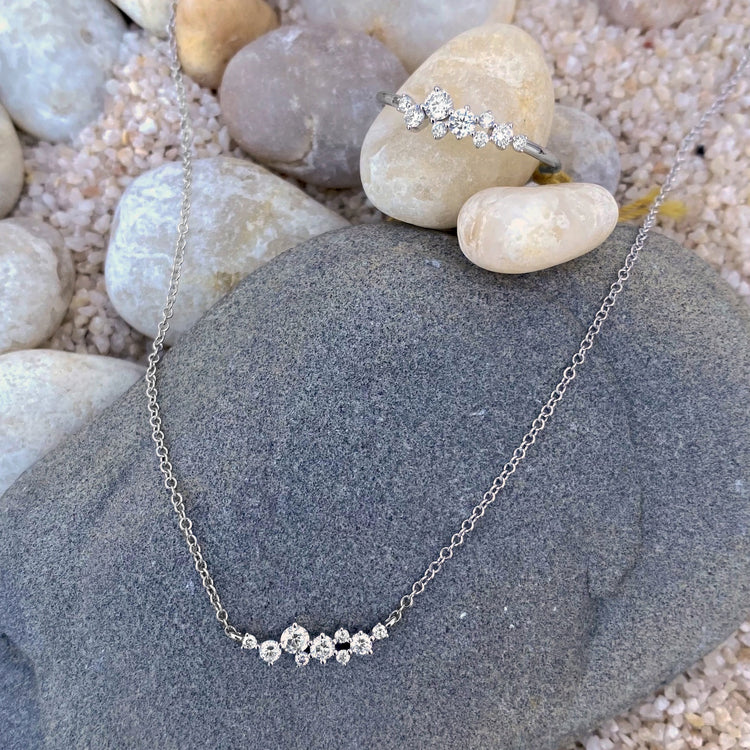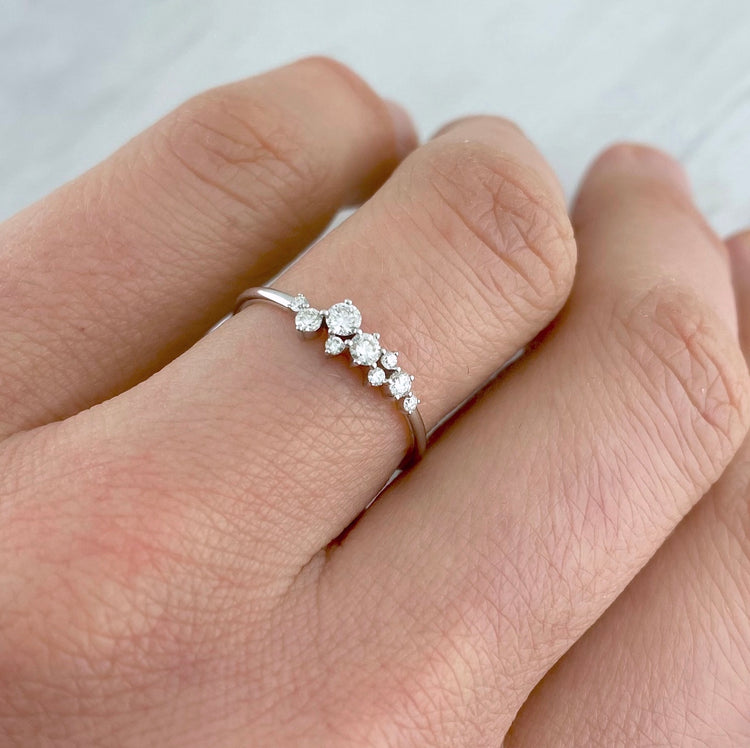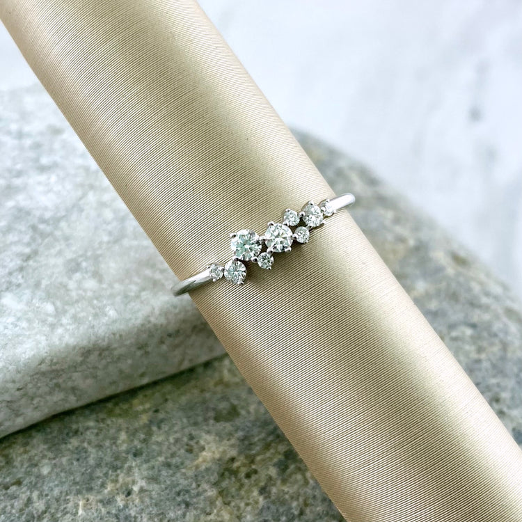 This ring is features 9 individual round diamond of various sizes set into a delicate and organic shaped cluster. Solid 14K white gold, rhodium plated for brightness. Pairs perfectly with our Petite 14K Petite Diamond Cluster Necklace.