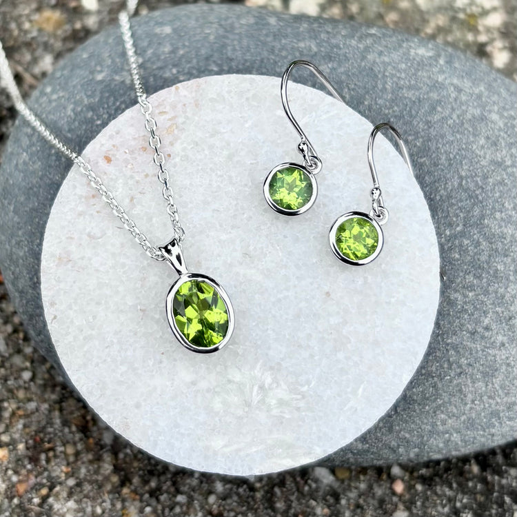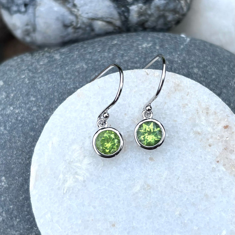 Sterling silver drop earrings featuring vibrant green peridot stones of the highest quality.  Simple and classic style.