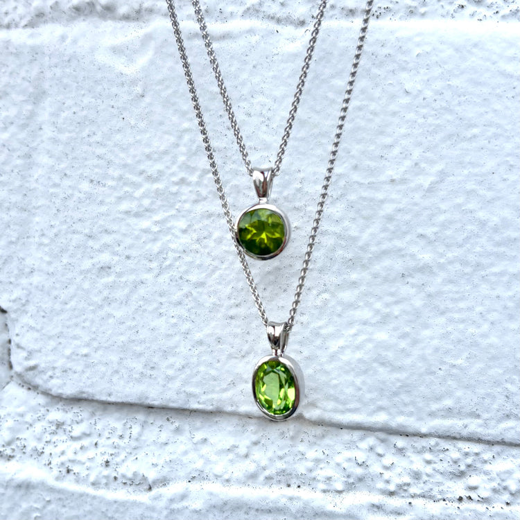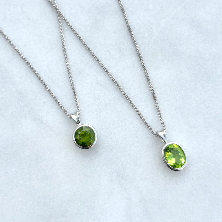 New silver and peridot pendants feature vibrant, exquisitely cut Peridot stones, bezel set in sterling silver. These pendants come on an adjustable 16-20" sterling silver chain. The color of Peridot varies from yellowish-green to dark olive, depending on the iron content within the individual gemstone, making each stone unique!  Choose from the darker round pendant or the lighter green oval pendant below.