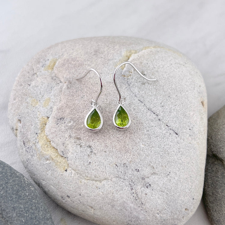 These vibrant teardrop Peridot earrings are bezel set in sterling silver with a fishhook post. 1.55 total carat weight
