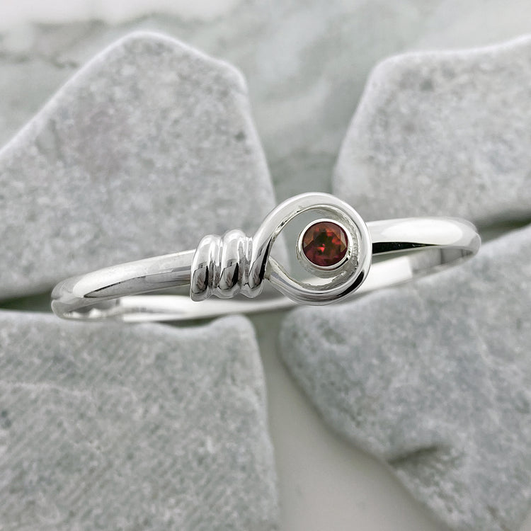 This Sterling Silver hook bracelet features a stunning Garnet gemstone set in the classic Shepherd's Knot. Garnet is the birthstone for the month of January.