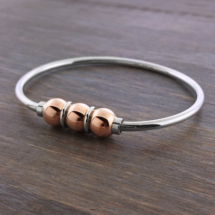 This bracelet is a beautiful statement piece, with three beads lined across the top. The three ball bracelet is often worn to symbolize three children, a 3rd anniversary, or another special meaning to the wearer. It is available in All Sterling Silver or solid 14k Yellow or Rose Gold + Sterling Silver.