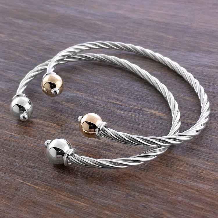 A unique "twist" on the traditional smooth bracelet! Two seperate pieces of sterling silver are wound together, creating a comfortable, flexible feel.  Featuring a classic Cape Cod ball on each end.