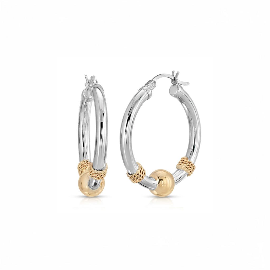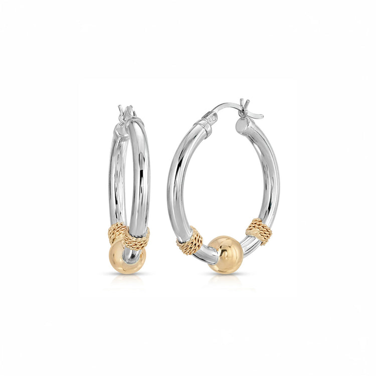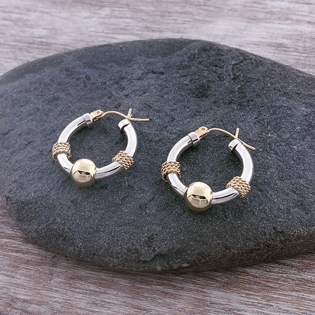 These single ball hoops are the medium size of the classic hoops with the addition of 14k gold nautical wire wrap on each side of the ball. These earrings are sterling silver with 14k gold beads and posts.
