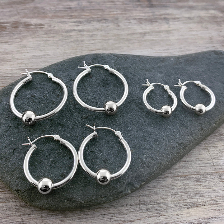 A lighter weight version of the classic hoops. The beads on these earrings are not stationary, but can move back and forth on the hoop. They are made from sterling silver.