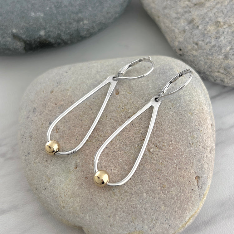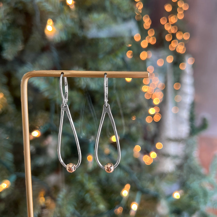 Handmade on Cape Cod, these earrings are inspired by beach sunsets. They feature the classic two tone style, with sterling silver looping down to a single 14k gold ball, available in yellow or rose gold!