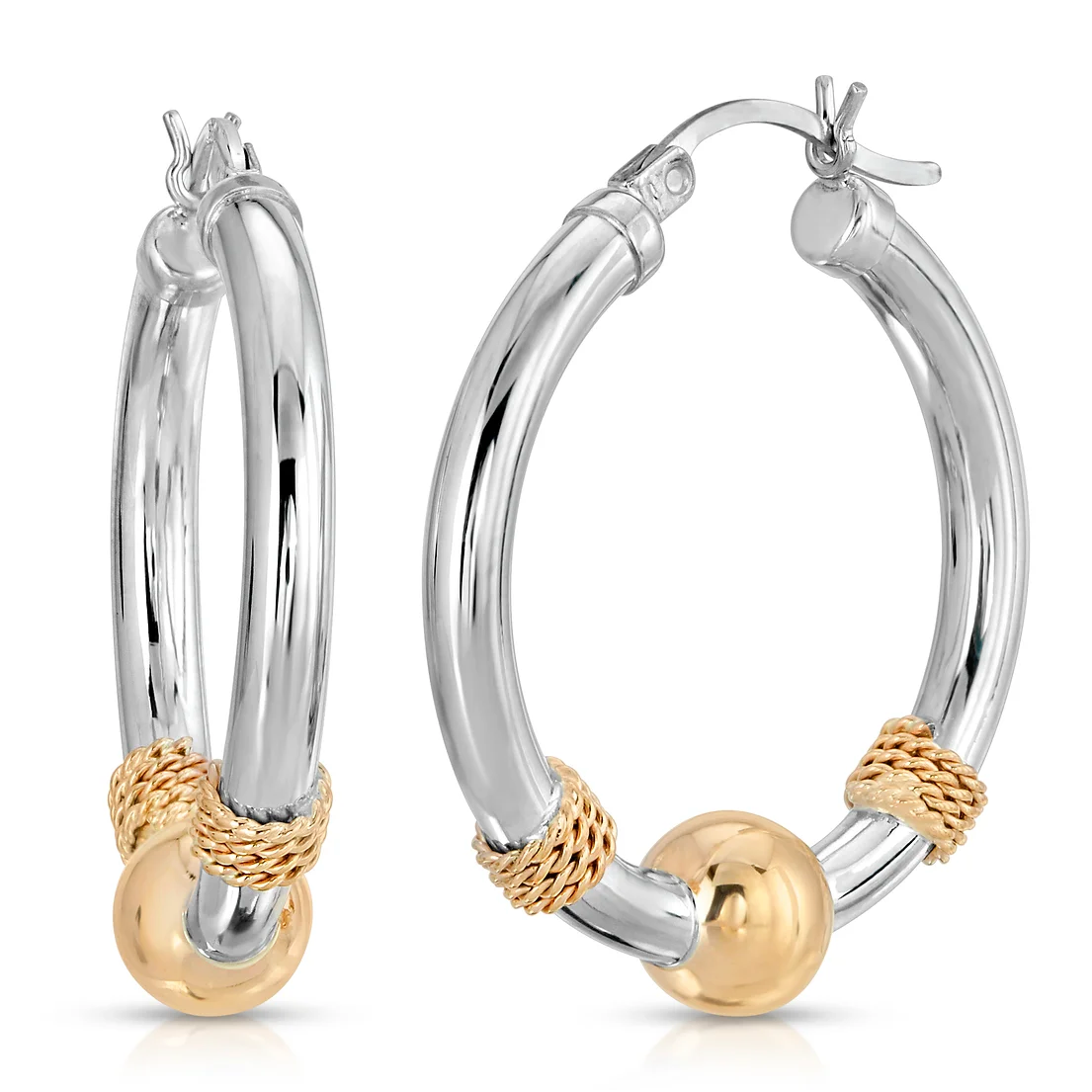 These single ball hoops are the medium size of the classic hoops with the addition of 14k gold nautical wire wrap on each side of the ball. These earrings are sterling silver with 14k gold beads and posts.