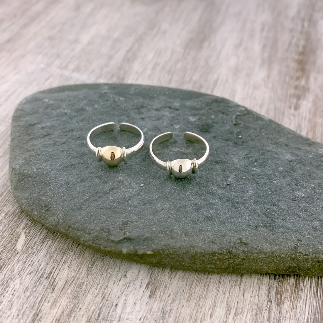 Available in all sterling silver or sterling silver with solid 14k gold. The toe rings are one size and have an opening in the back making them adjustable. They are smaller and thinner than the single ball ring. The ball is flat on the back for a comfortable fit.