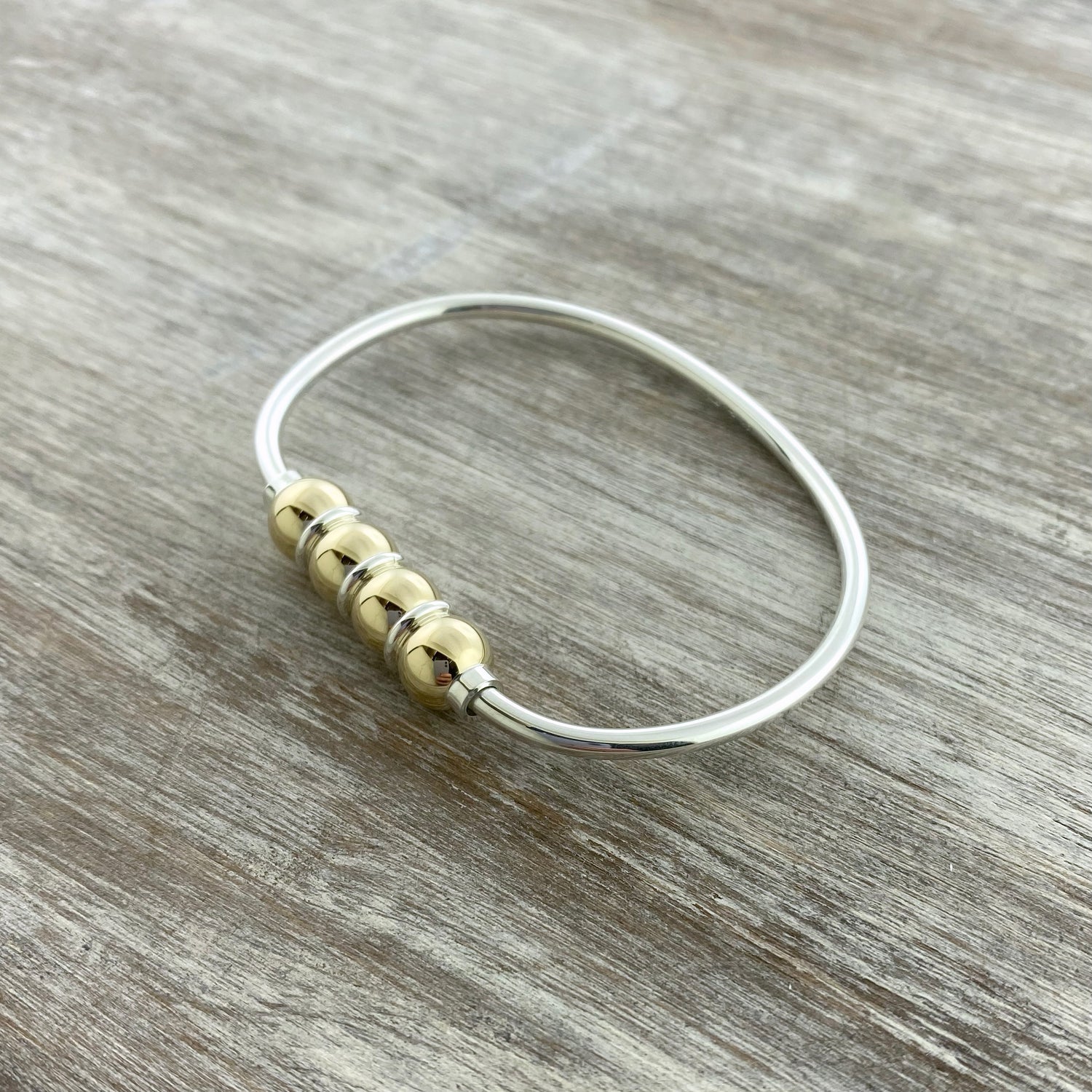 This bracelet is a beautiful statement piece, with four beads lined across the top. The four ball bracelet is often worn to symbolize four children, a 4th anniversary, or another special meaning to the wearer. It is available in all sterling silver or solid 14k yellow gold and sterling silver.