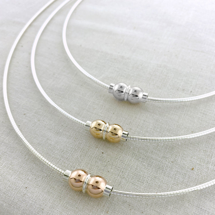 The Cape Cod Omega necklace is for someone who is looking for a more rounded collar shape. The omega necklace is not completely rigid, but it does have less flexibility than a traditional chain - it holds its round shape (as shown in the picture) rather than dipping into a "V" around the neck. The double bead gives this necklace an elevated look!