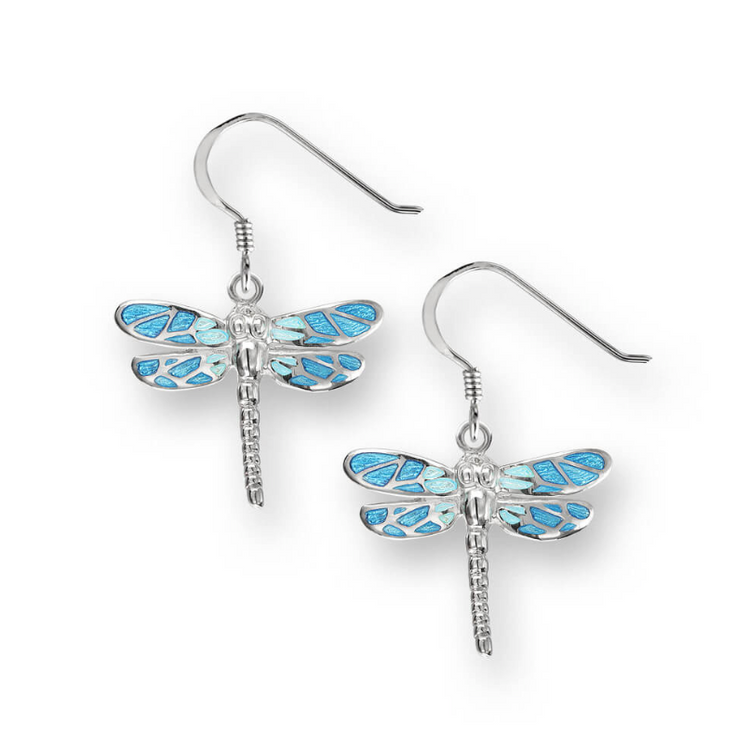 Blue Dragonfly Wire Earrings in Sterling Silver with Vitreous Enamel. Rhodium Plated for easy care.