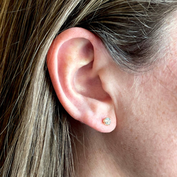 This pair of sterling silver stud earrings feature a petite light colored aquamarine in a minimalist four prong setting. The aquamarine stones measure 4mm each. Butterfly back posts with a safety groove ensure a comfortable and secure fit. Rhodium plated for easy care