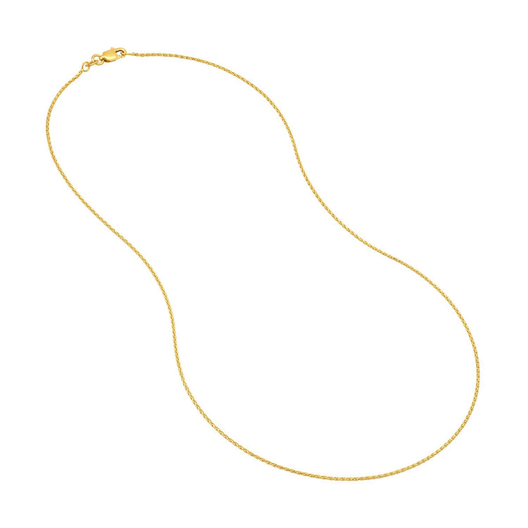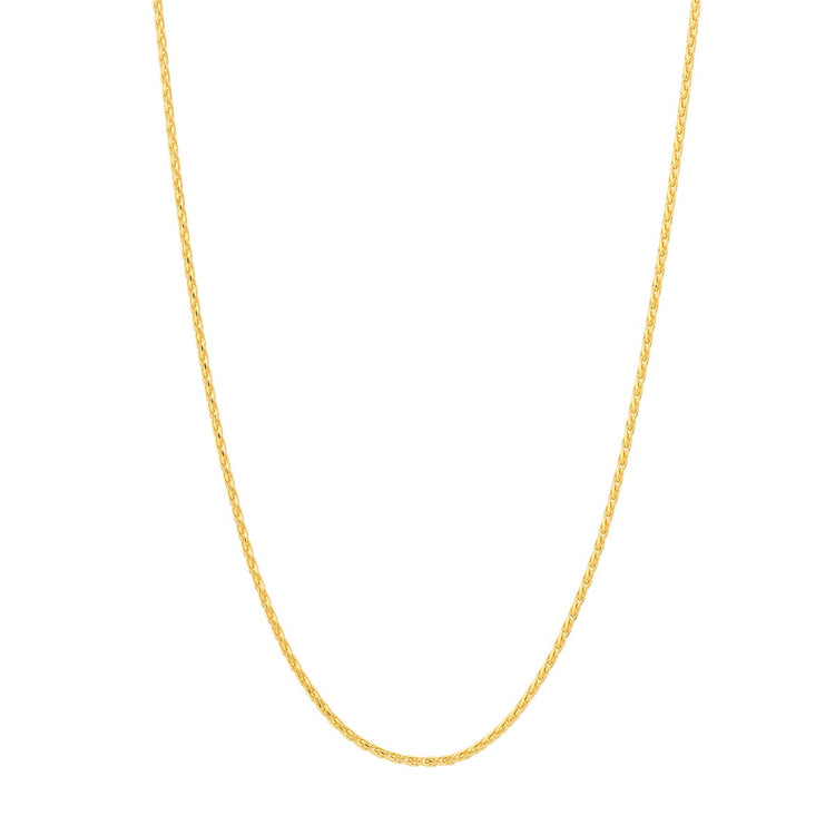14K yellow gold diamond cut wheat chain in a slightly heavier weight than our standard pendant chain.  This chain pairs well with pendants in the medium to larger size range. Diamond cut accents give the chain a subtle sparkle.  Available in various lengths.