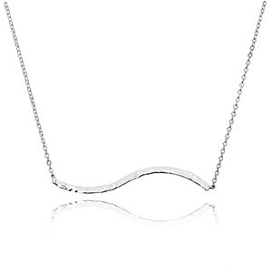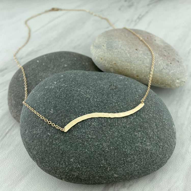 14K gold hand hammered wave necklace in an elegant and simple design.  Perfect on its own or as a layered piece. Carry the calm and beauty of the water around your neck.  18" length.