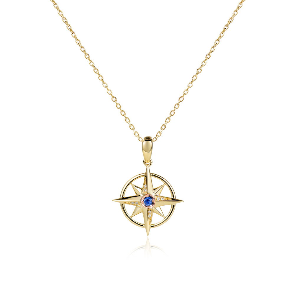 This stunning 14K yellow gold compass rose pendant features a central blue sapphire with accents of sparkling natural diamonds.
