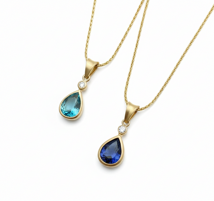 We have one new pendant back in stock!  The beautiful rich hue of this sparkling blue zircon makes this stone especially unique and desirable! This iteration features a 2.49 carat teal blue zircon stone, bezel set in 14K Gold with a satin finish and a .03 ct diamond accenting the pendant.