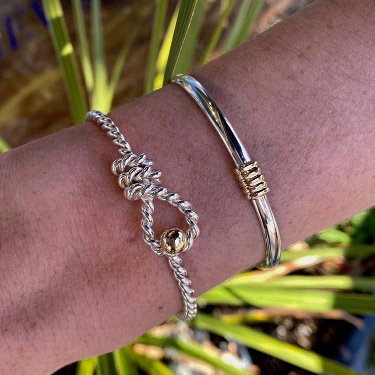 Add to your stack with this simple and timeless design, this sterling silver cuff bracelet features a central 14k gold wrap for two tone pop. This new cuff pairs beautifully with, and is a great addition to any of our Cape Cod and two tone bracelets.