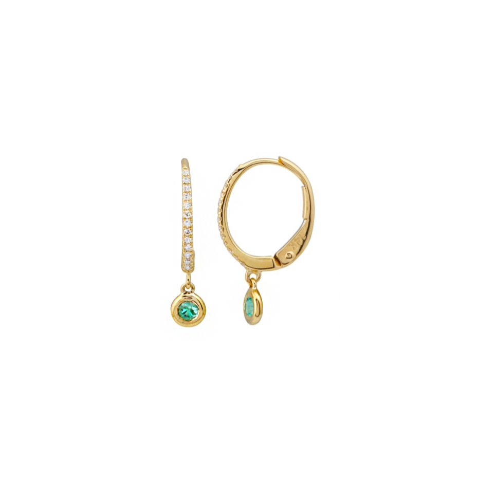 These 14k Yellow Gold petite huggie earrings feature natural diamonds set within the hoop front and a small bezel set natural emerald drop.
