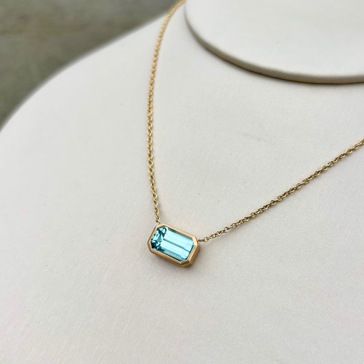 This stunning emerald cut Aquamarine captivates with the most mesmerizing ocean blues. A gorgeous statement piece that can be worn casually or dressed up. The 2.25 ct stone is bezel set in 14K yellow gold with a satin finish. It is attached to a 14K yellow gold cable chain that measures 18" in length and features a lobster claw clasp.