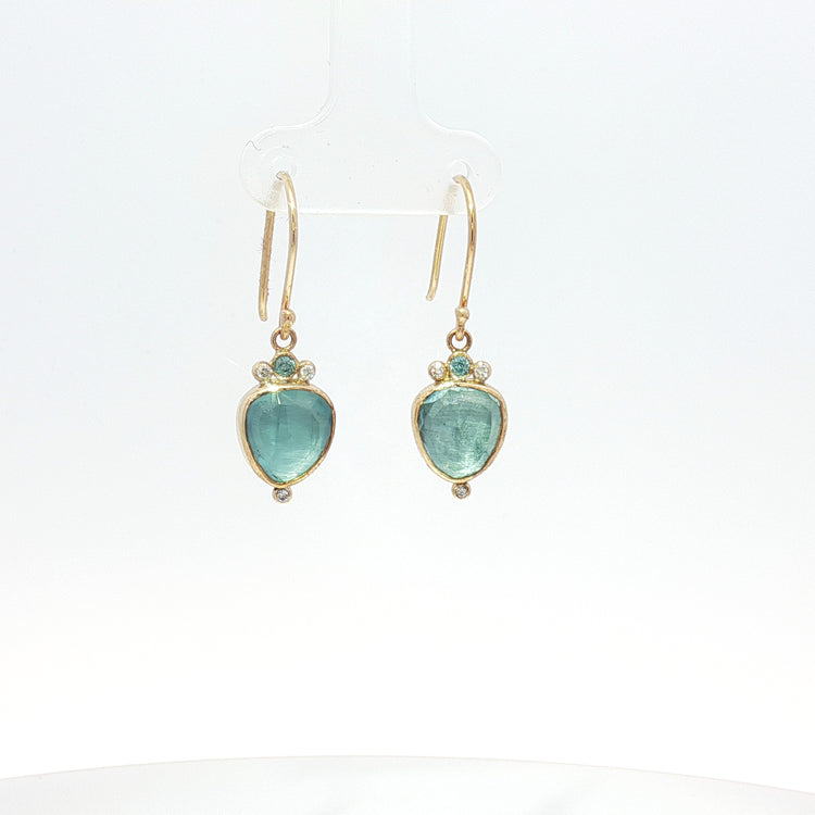 Stunning and shimmering oceanic aqua blue drop earrings.  Designed by Emily Amey, these feature deep Aquamarine stones in a lovely inverted teardrop shape, topped with aqua sapphires and natural diamonds. Set in 14K yellow gold with classic ear wires.
