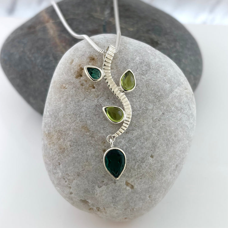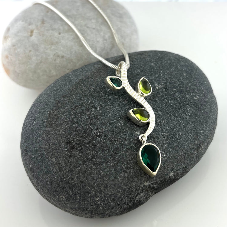 Green quartz and peridot stones make up the vibrant greens in this hand crafted necklace.  Textured sterling silver adds to the details in this botanical-inspired necklace. Comes on an 18" sterling silver snake chain.  Email us for other chain lengths.