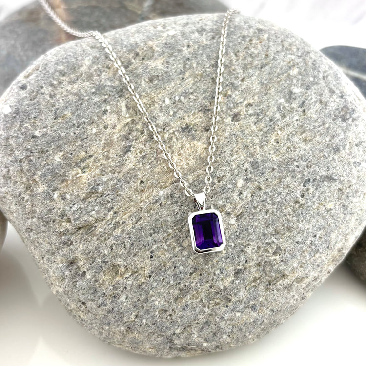 This vibrant 1.48 ct amethyst is emerald cut and bezel set in sterling silver.