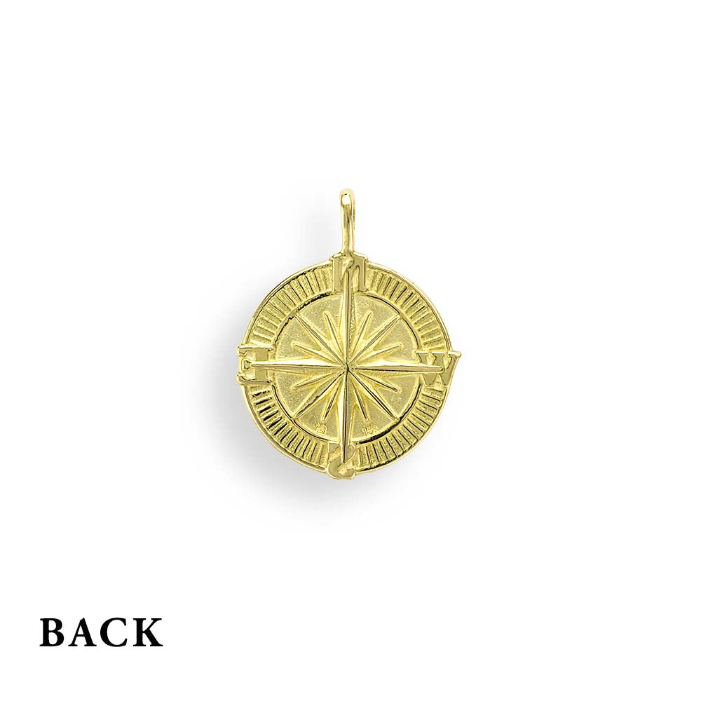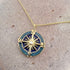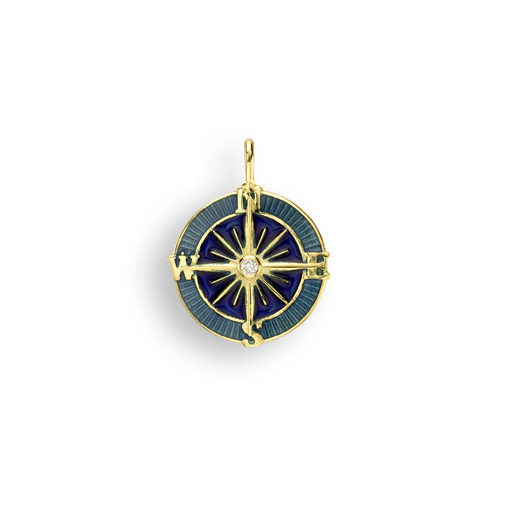 This is a stunning two sided solid 18K gold compass rose pendant. One side features beautiful navy and ultra marine vitreous enamel and a diamond center. The other side is engraved in all gold.