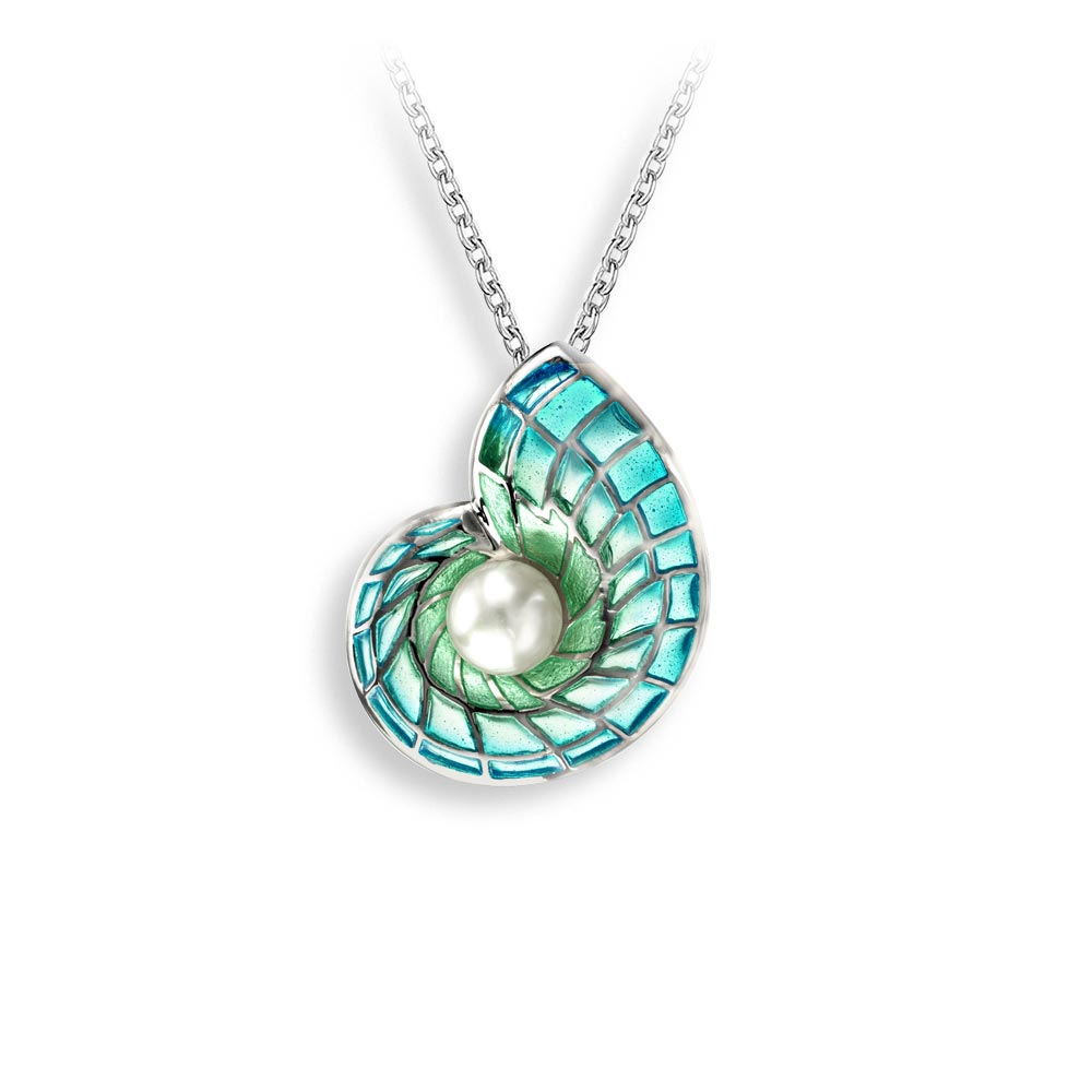 Blue Nautilus Shell Necklace in Sterling Silver with Plique-a-Jour Vitreous Enamel and Freshwater Pearl. Adjustable 18 inch chain included. Rhodium Plated for easy care.