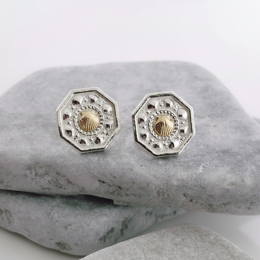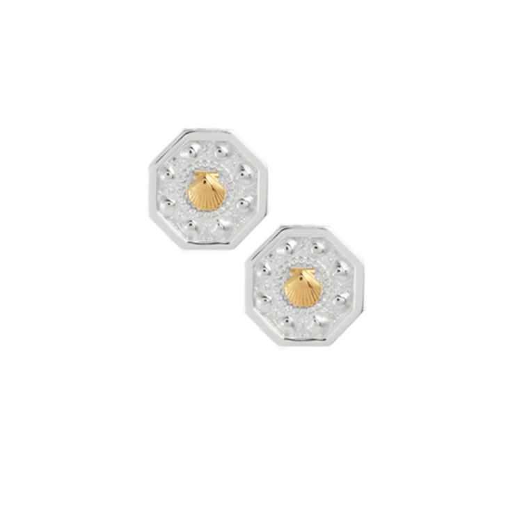 Designed by The Touch - these two-tone 14k Gold and Sterling Silver stud earrings feature the classic Sailor's Valentine with a 14k Gold Scallop on a bed of Sterling Silver clam shells.