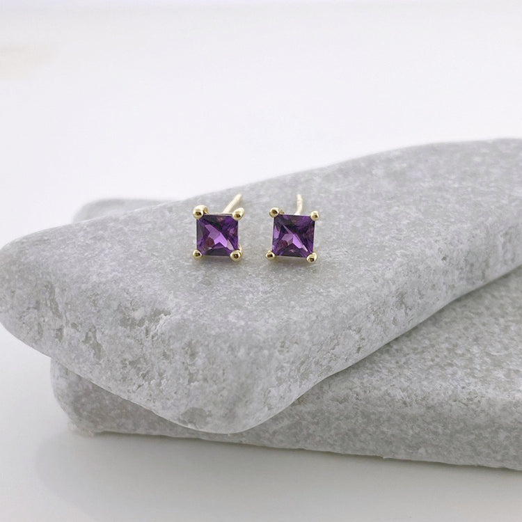 These beautiful 14K Gold earrings feature a vibrant square Amethyst in a minimalist gold four prong setting.