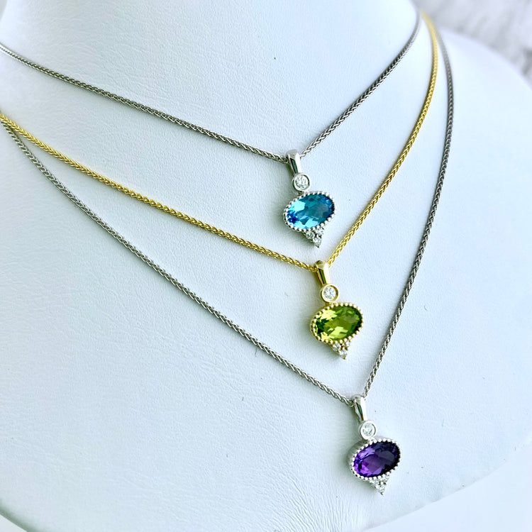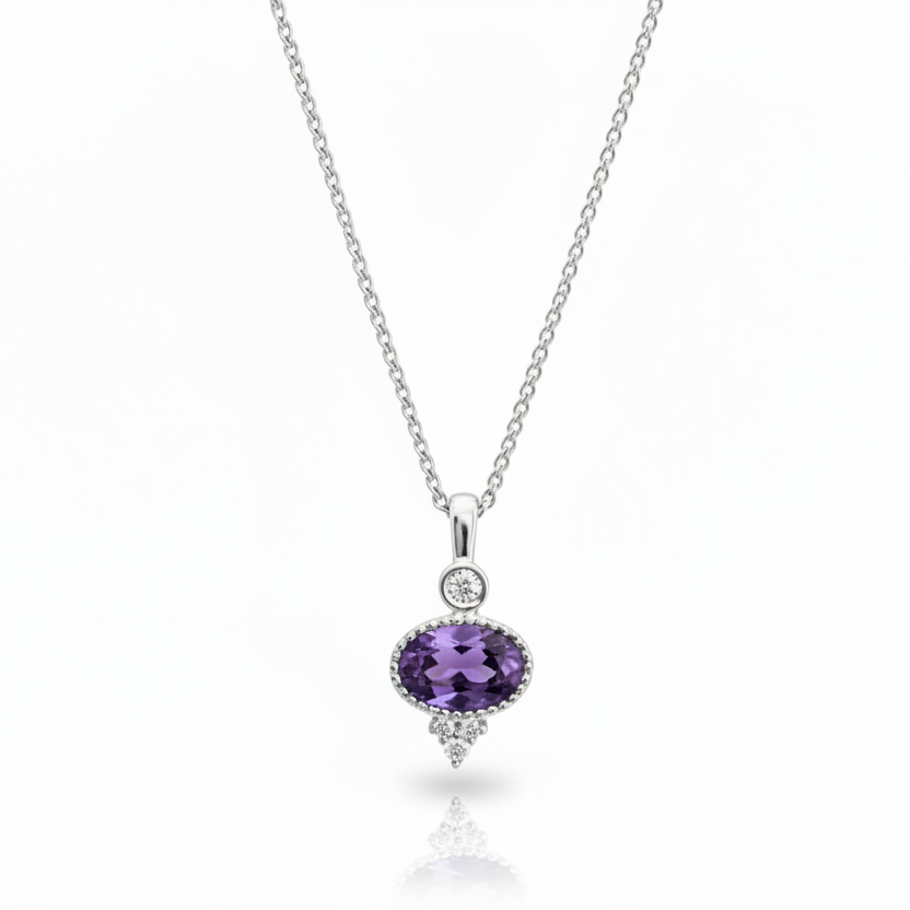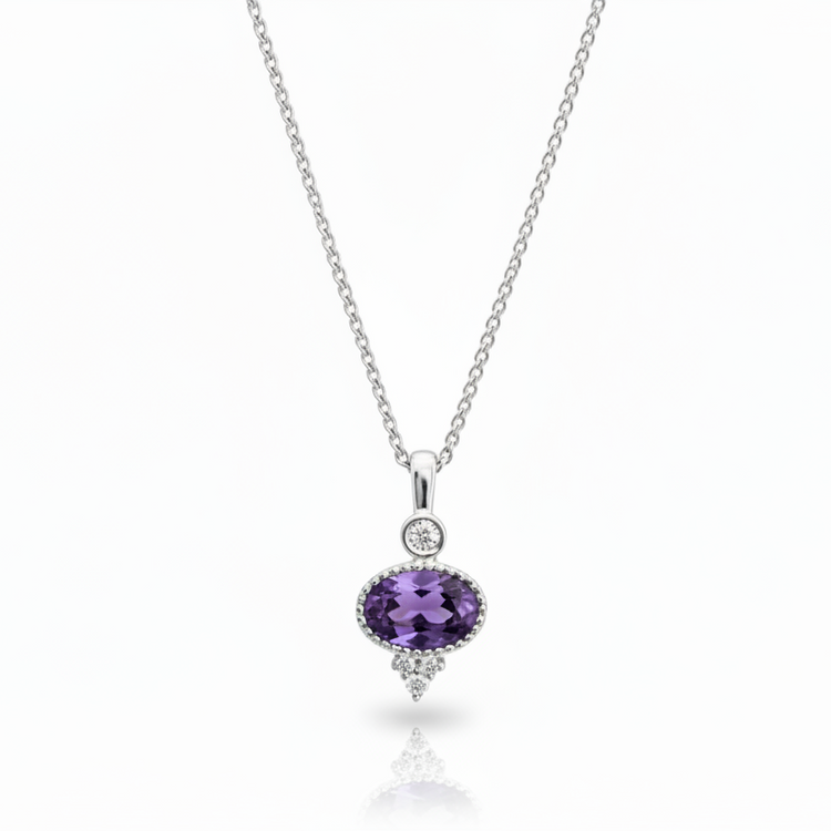 This mini gemstone necklace features a beautifully cut oval amethyst bezel set in 14K white gold accented with petite diamonds!