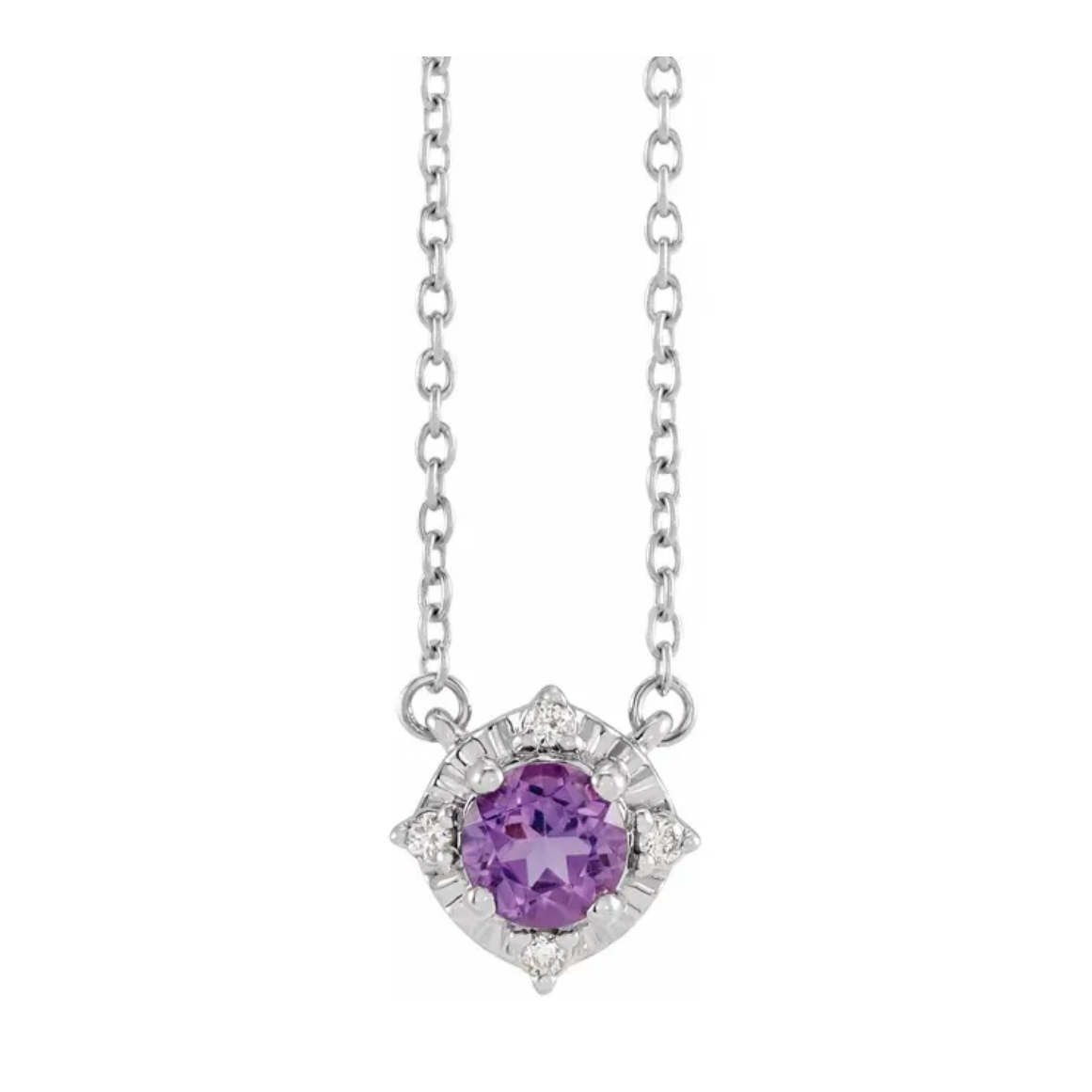 This beautiful necklace features an amethyst accented by four petite natural diamonds in a sparkling illusion setting.