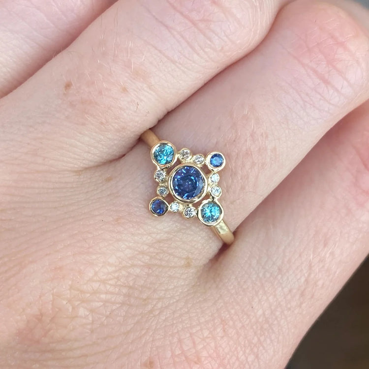 Inspired by the cosmic beauty of the Andromeda Galaxy, this stunning ring showcases a shimmering sapphire centerpiece surrounded by a sparkling halo of diamonds and blue zircons. Set in 14K yellow gold, it's the perfect piece for anyone who is drawn to the blues of the ocean or skies. Handmade by Emily Amey in Hudson Valley, NY.