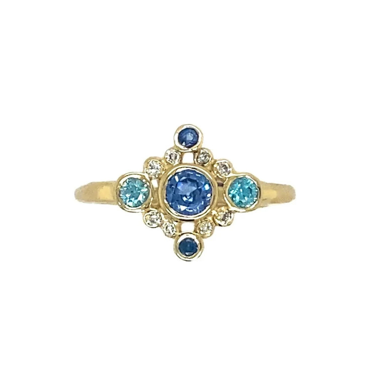 14K Andromeda Sapphire, Diamond + Blue Zircon Ring