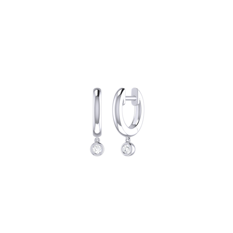 These huggie style hoops are set in 14K white gold and feature a dangling petite diamond. The earrings open on a hinge with a secure snap closure.