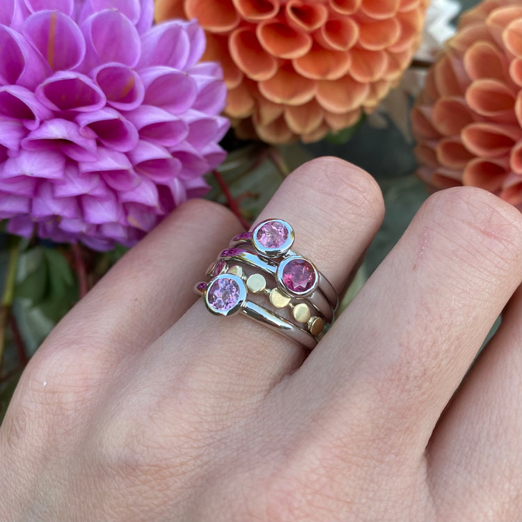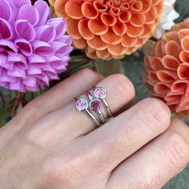 Simple and easy to wear, this round pink tourmaline sparkles in a low bezel setting.  Great for stacking or wearing alone.  This product is for one ring (some photos picture multiple worn together). Each ring will vary slightly in pink color. Available in sizes 6, 7, 8.  Contact us for other sizes.