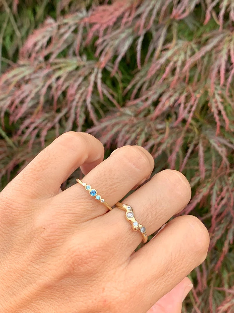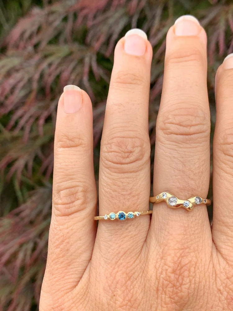 The Summer Skies band features sparkling diamonds and teal-blue zircons flush set in a fluid, organic-shaped sterling silver band.