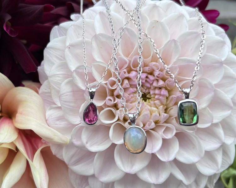 Two vibrant pink tourmaline stones sparkle in these simple and elegant bezel set pendants.  Stones are set in sterling silver and hung from 18-19" silver cable chains.  Choose from smaller .92 carat pendant, with vibrant pink color, or larger 1.03 carat oval pendant, with deep pink color.  Tourmaline is the birthstone for October.  Contact us for other length chains.