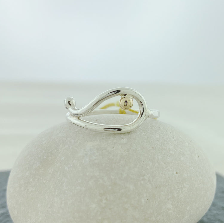 This hand-crafted sterling silver ring features a 14k gold eye and has a classic, yet whimsical abstract whale design.