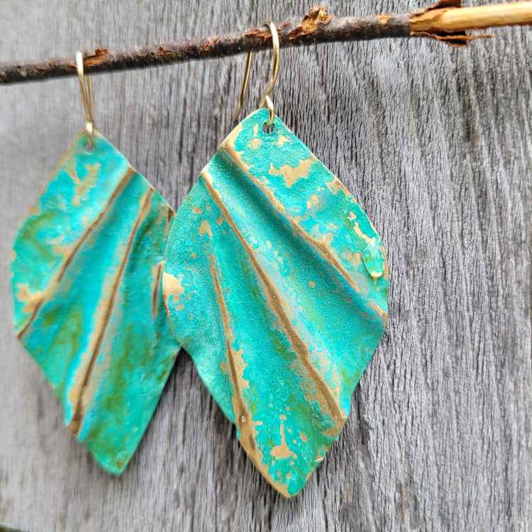 They have a gorgeous turquoise color achieved through patina on brass. Gold filled ear wires. Earrings are approximately 1.5 inches long and 1 inch wide.