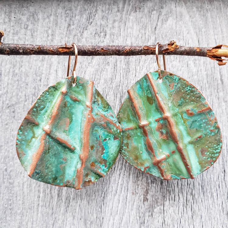 They have a gorgeous turquoise color achieved through patina on brass. Gold filled ear wires.