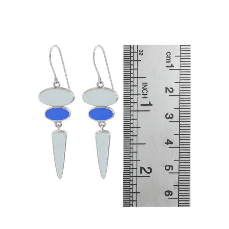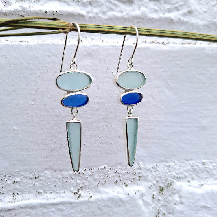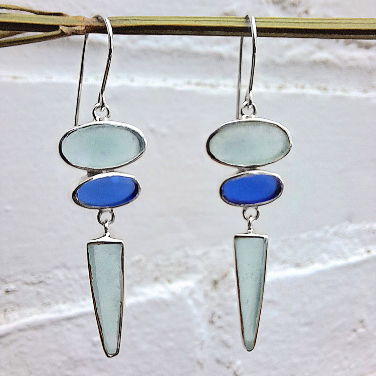 Designed by Misti Martin, the Sea Glass Trio Silver Drop Earrings, feature stacked oval pieces in aqua and cobalt shades. Made from genuine Sea Glass and set in Sterling Silver. These earrings have a length of 2 inches.